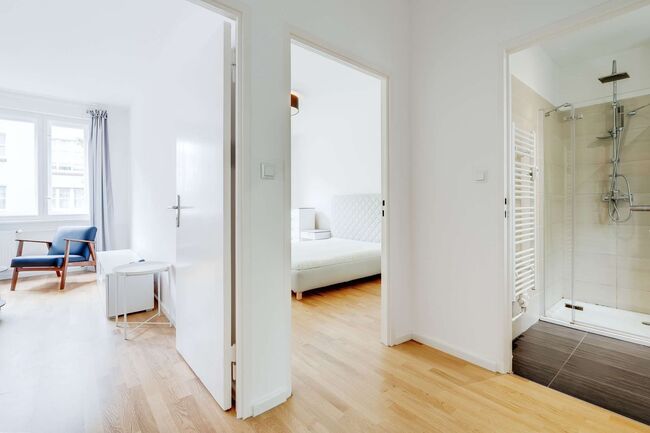 Das 1952 erbaute und unter Denkmalschutz stehende Gebäude wurde komplett saniert und mit modernem Wohnkomfort ausgestattet. Der Charme der 50er Jahre ist in vielen Details noch zu spüren. Der sehr gut durchdachte Grundriss macht diese 2- Zimmer Wohnung zu einem idealen Ort sowohl für Singles als auch für zwei Personen. Die Wohnung ist mit einer Einbauküche ausgestattet. Große Fenster und Echtholzparkett verleihen den beiden Zimmern eine angenehme Wohnatmosphäre. Die Küche und das Bad haben jeweils ein Fenster zum Innenhof und eine Kammer bietet Platz für die Waschmaschine.