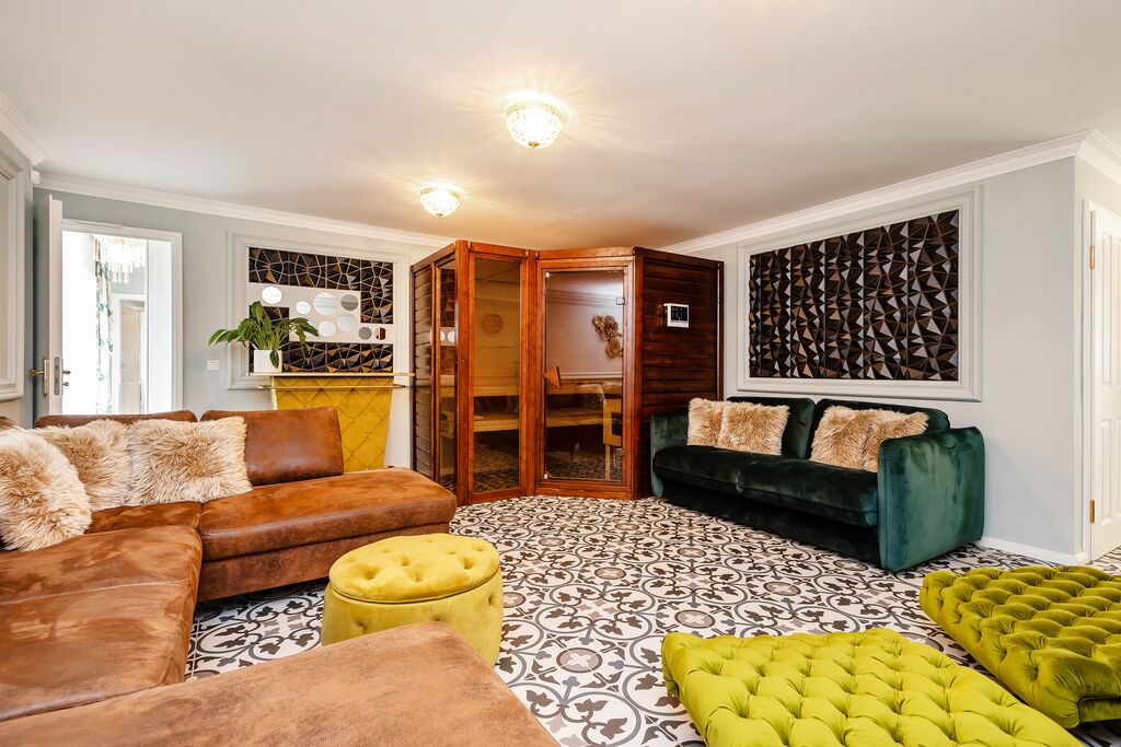 Sehr großzügig ist der Wäscheraum mit viel Platz für Waschmaschinen und Trockner. Die Garage wurde in ein Highlight umgenutzt. Sie finden hier, auf knapp 35 m² verteilt, einen eleganten Wellnessbereich mit Sauna und einladenden Liegen, separater Dusche und WC.