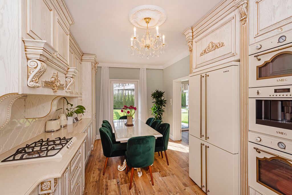 Im lichtdurchfluteten Wohnzimmer mit Kamin und bodentiefen Fenstern können Sie gemütliche Abende verbringen. Die edle Einbauküche verfügt über hochwertige Markengeräte und praktischer Speisekammer. Sie bildet das Herzstück des Familienlebens und bietet genug Platz für einen großen Esstisch. Von hier aus gibt es auch einen direkten Zugang zur sonnigen Terrasse, welche für entspannte Stunden im Freien sorgt.